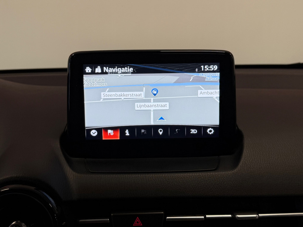 Spraakbediening herkent uw stem en voert opdrachten uit terwijl u beide handen aan het stuur houdt. De kortste weg, de zuinigste weg, de snelste weg... elke weg is te vinden met het navigatiesysteem. Deze Mazda 2 denkt vooruit als u van plan bent af te slaan. De kruisend verkeer detectie calculeert en analyseert het tegemoetkomende verkeer en waarschuwt als het risico op aanrijding bestaat. In een auto als deze kunt u niet zonder automatische airconditioning, zodat de temperatuur altijd goed is. De DAB-ontvanger zorgt voor een ruime keuze uit digitale radiozenders en een kristalheldere geluidsweergave. Ook parkeersensoren achter, regensensor, cruise control, lederen stuur, centrale deurvergrendeling met afstandsbediening en boordcomputer horen tot de voorzieningen op deze auto.